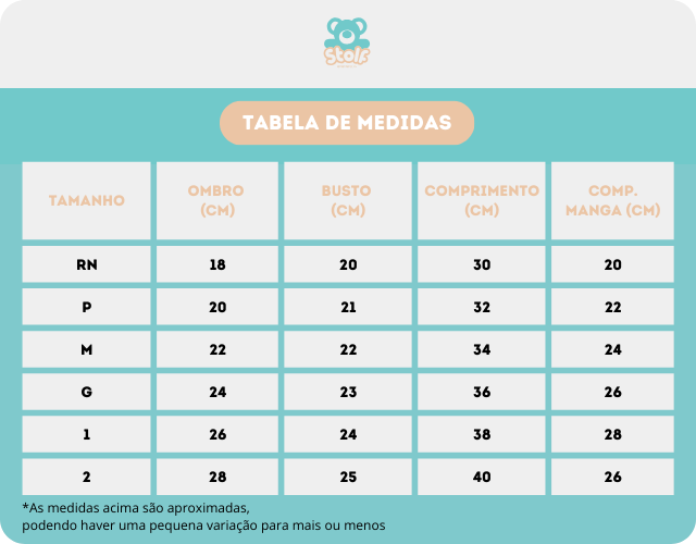 "Lembre-se, mamãe: as roupas de 100% algodão (principalmente canelado) têm maior probabilidade de encolher após a lavagem. Por isso, ao fazer o comparativo das medidas na hora da compra, leve em consideração que as peças podem reduzir um pouco de tamanho após a lavagem. Para garantir um ajuste perfeito, recomendamos escolher um tamanho um pouco maior que o usual. Assim, você evita surpresas desagradáveis e garante que as roupas dos seus pequenos tenham o tamanho ideal mesmo após a lavagem."