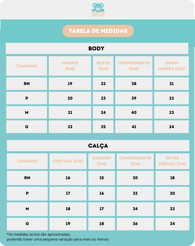 "Lembre-se, mamãe: as roupas de 100% algodão têm maior probabilidade de encolher após a lavagem. Por isso, ao fazer o comparativo das medidas na hora da compra, leve em consideração que as peças podem reduzir um pouco de tamanho após a lavagem. Para garantir um ajuste perfeito, recomendamos escolher um tamanho um pouco maior que o usual. Assim, você evita surpresas desagradáveis e garante que as roupas dos seus pequenos tenham o tamanho ideal mesmo após a lavagem."