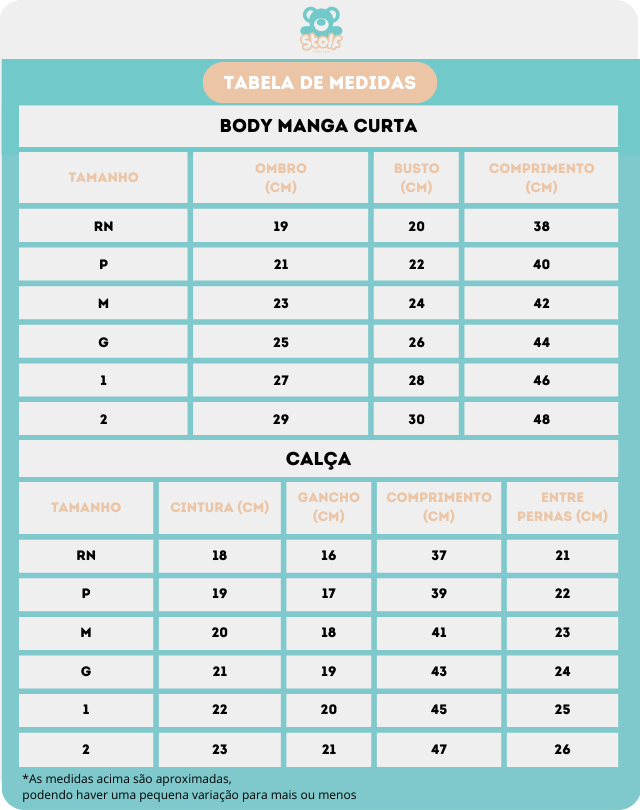 "Lembre-se, mamãe: as roupas de 100% algodão têm maior probabilidade de encolher após a lavagem. Por isso, ao fazer o comparativo das medidas na hora da compra, leve em consideração que as peças podem reduzir um pouco de tamanho após a lavagem. Para garantir um ajuste perfeito, recomendamos escolher um tamanho um pouco maior que o usual. Assim, você evita surpresas desagradáveis e garante que as roupas dos seus pequenos tenham o tamanho ideal mesmo após a lavagem."