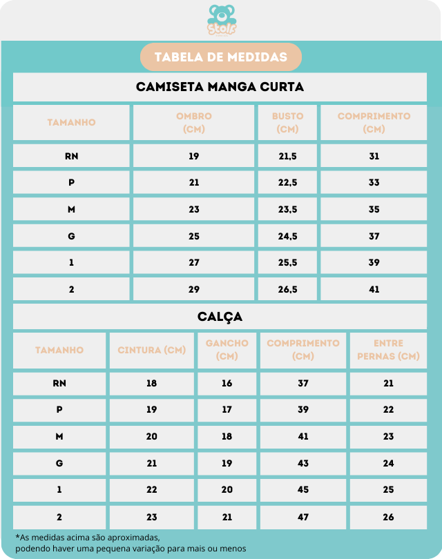"Lembre-se, mamãe: as roupas de 100% algodão têm maior probabilidade de encolher após a lavagem. Por isso, ao fazer o comparativo das medidas na hora da compra, leve em consideração que as peças podem reduzir um pouco de tamanho após a lavagem. Para garantir um ajuste perfeito, recomendamos escolher um tamanho um pouco maior que o usual. Assim, você evita surpresas desagradáveis e garante que as roupas dos seus pequenos tenham o tamanho ideal mesmo após a lavagem."