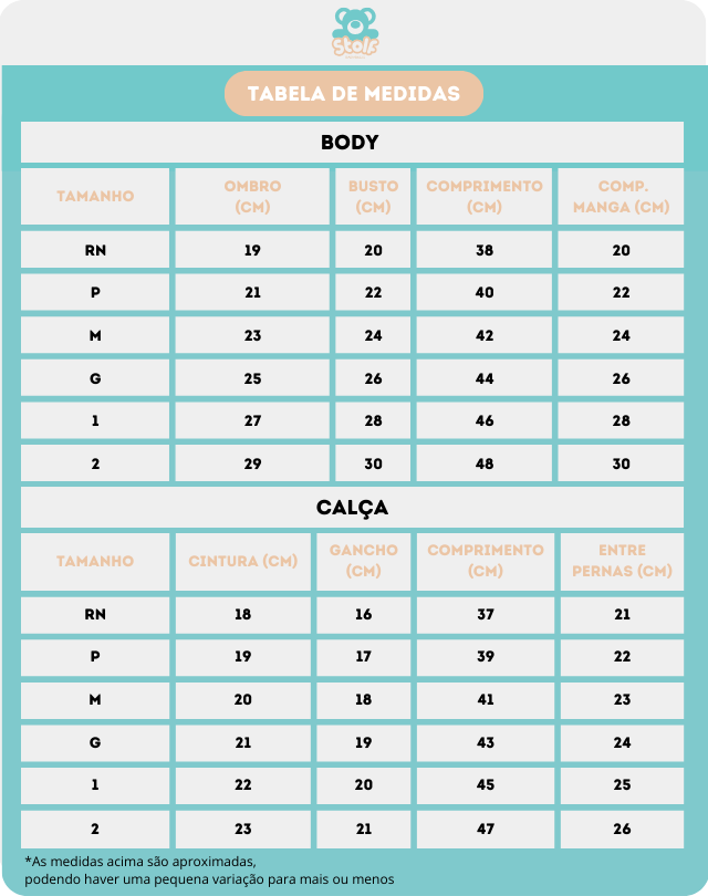 "Lembre-se, mamãe: as roupas de 100% algodão têm maior probabilidade de encolher após a lavagem. Por isso, ao fazer o comparativo das medidas na hora da compra, leve em consideração que as peças podem reduzir um pouco de tamanho após a lavagem. Para garantir um ajuste perfeito, recomendamos escolher um tamanho um pouco maior que o usual. Assim, você evita surpresas desagradáveis e garante que as roupas dos seus pequenos tenham o tamanho ideal mesmo após a lavagem."