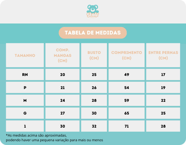 "Lembre-se, mamãe: as roupas de 100% algodão (principalmente canelado) têm maior probabilidade de encolher após a lavagem. Por isso, ao fazer o comparativo das medidas na hora da compra, leve em consideração que as peças podem reduzir um pouco de tamanho após a lavagem. Para garantir um ajuste perfeito, recomendamos escolher um tamanho um pouco maior que o usual. Assim, você evita surpresas desagradáveis e garante que as roupas dos seus pequenos tenham o tamanho ideal mesmo após a lavagem."